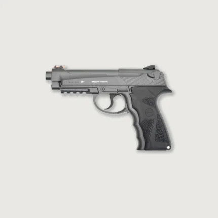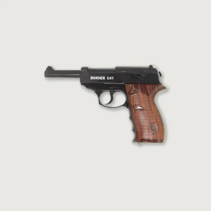 Borner C41 is a replica of the legendary Walther P38 from the Second World War. The metal frame is outfitted with polymer grips. The slide is movable, but has no Blowback system. This air pistol is designed to shoot steel BBs in .177 caliber (4,5 mm), which makes it perfect for plinking. The magazine has a capacity of 18 shots.
