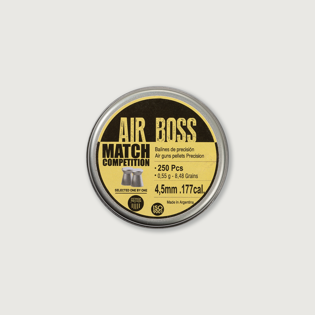 Air Boss Match Competition pellets are extremely well made pellets which suit both air rifle and air pistols thanks to their aerodynamic and simple shape. This design also helps the pellets achieve excellent accuracy and consistency results down range. The pellets are all made from high grades of lead which assists in fast acceleration and high velocities figures for a flat trajectory which assists in target acquisition. The pellets are also checked through each stage of production to ensure they meet ISO 9001 quality standards and only the best are loaded into the final tins.
