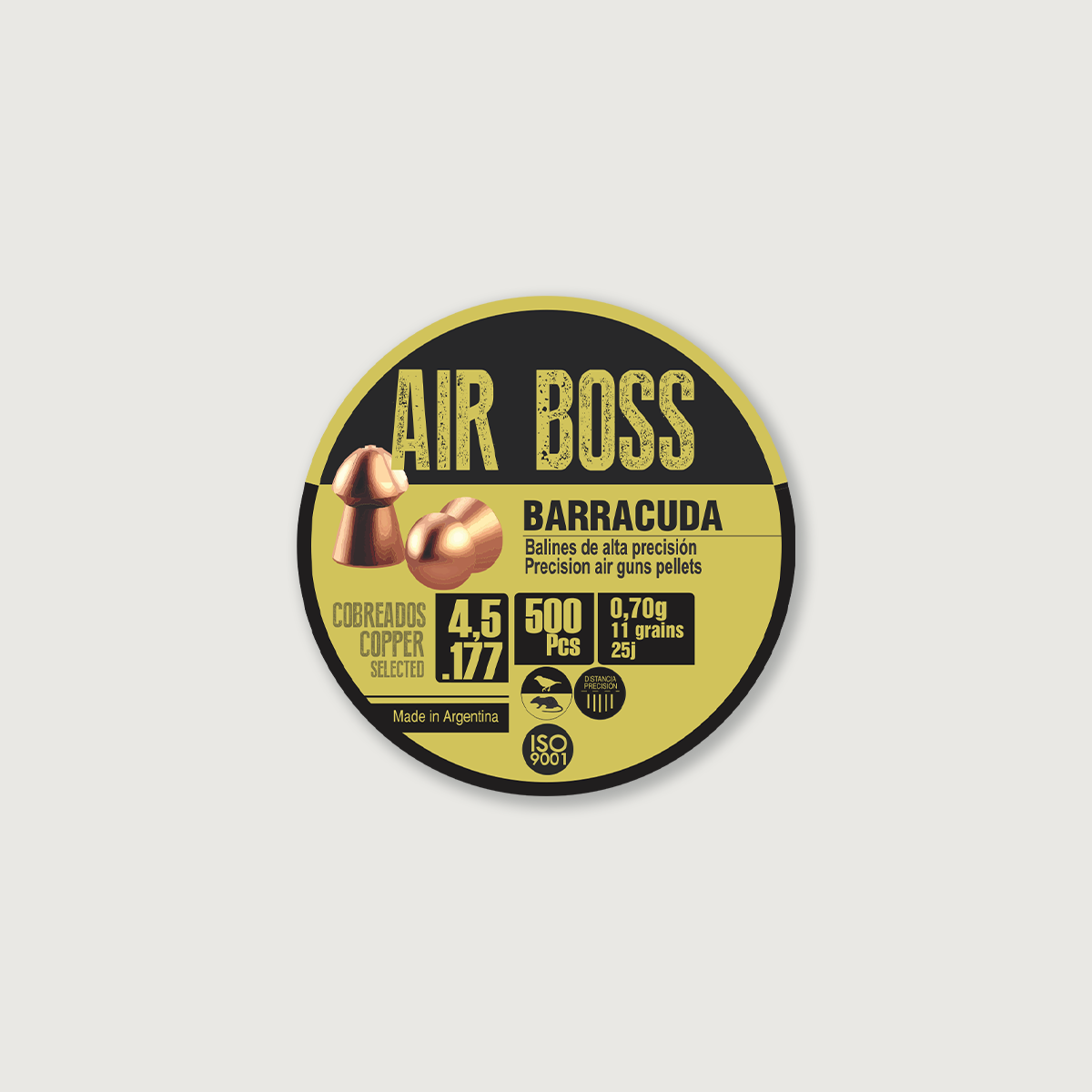 Air Boss Barracuda Copper .177, selected (Selected One by One) premium and copper-plated bullets with a round head (Round type) from the Argentinean company Apolo in 4.5 mm caliber. Very fast, designed for Field Target, HFT (provides excellent focus) and vermin hunting (high stopping power). An ideal devastating target shot designed for air spring and PCP rifles.