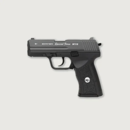 Borner CLT 125 is powered by a single 12g CO2 cartridge, which should give you about 60 shots. The black polymer grips are checkered for safer handling. The CO2 cartridge is stored inside the grip. The magazine has a capacity of 20 shots.