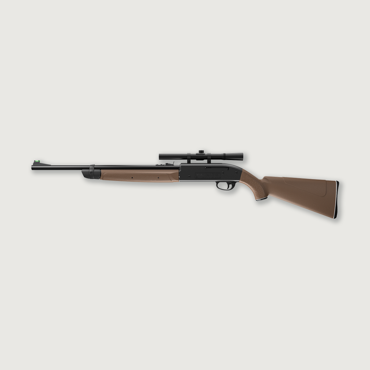 - Durable water-resistant, synthetic design in brown with a rifled steel barrel