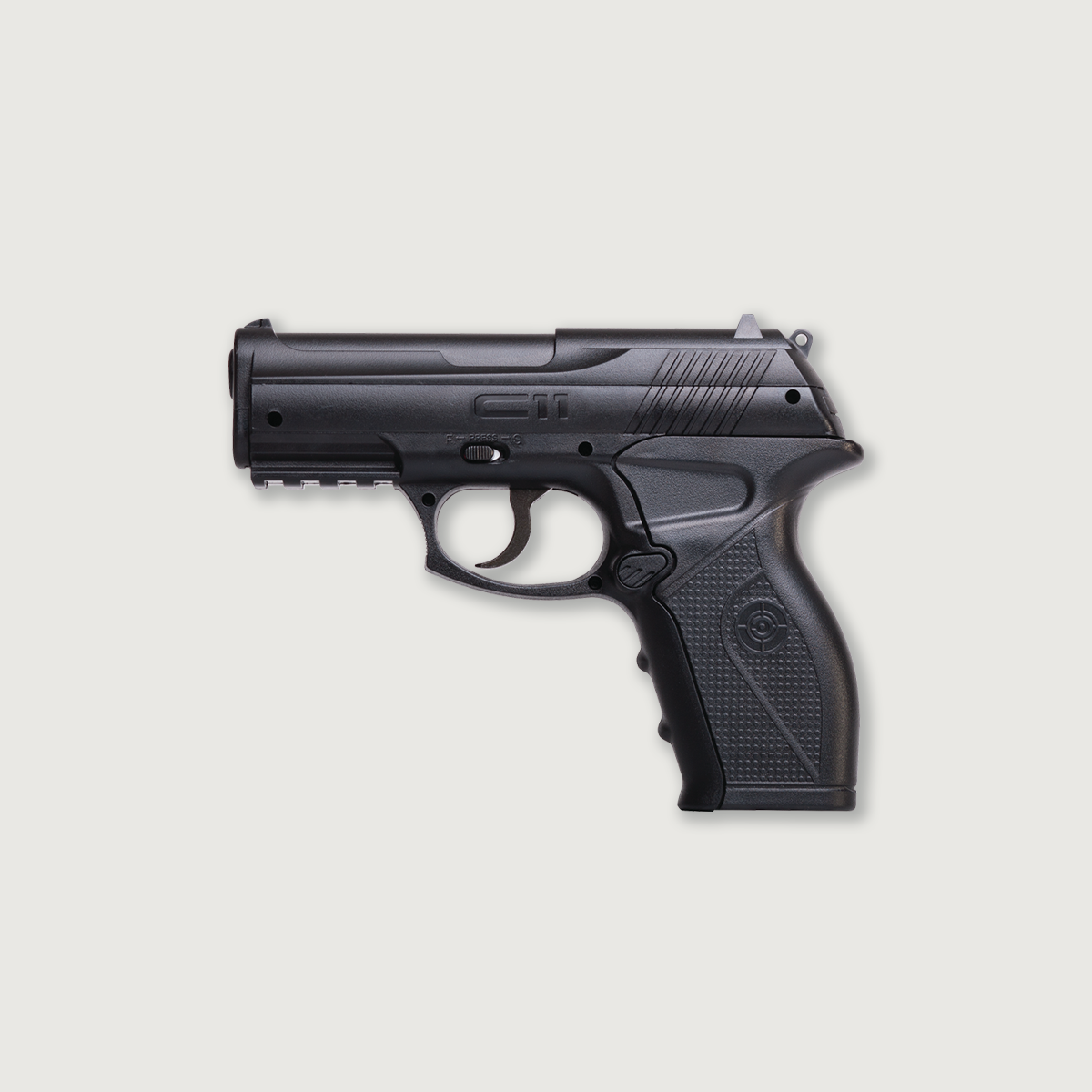 4.5 mm CO2 Powered, BB pistol – This semi-automatic CO2 powered pistol combines hand-held comfort with quality components, at an affordable price. It features a velocity of up to 480 feet per second and an accessory rail under the barrel. The C11 also features a removable magazine for BBs, as well as grips that slide back for easy replacement of CO2 Powerlets.