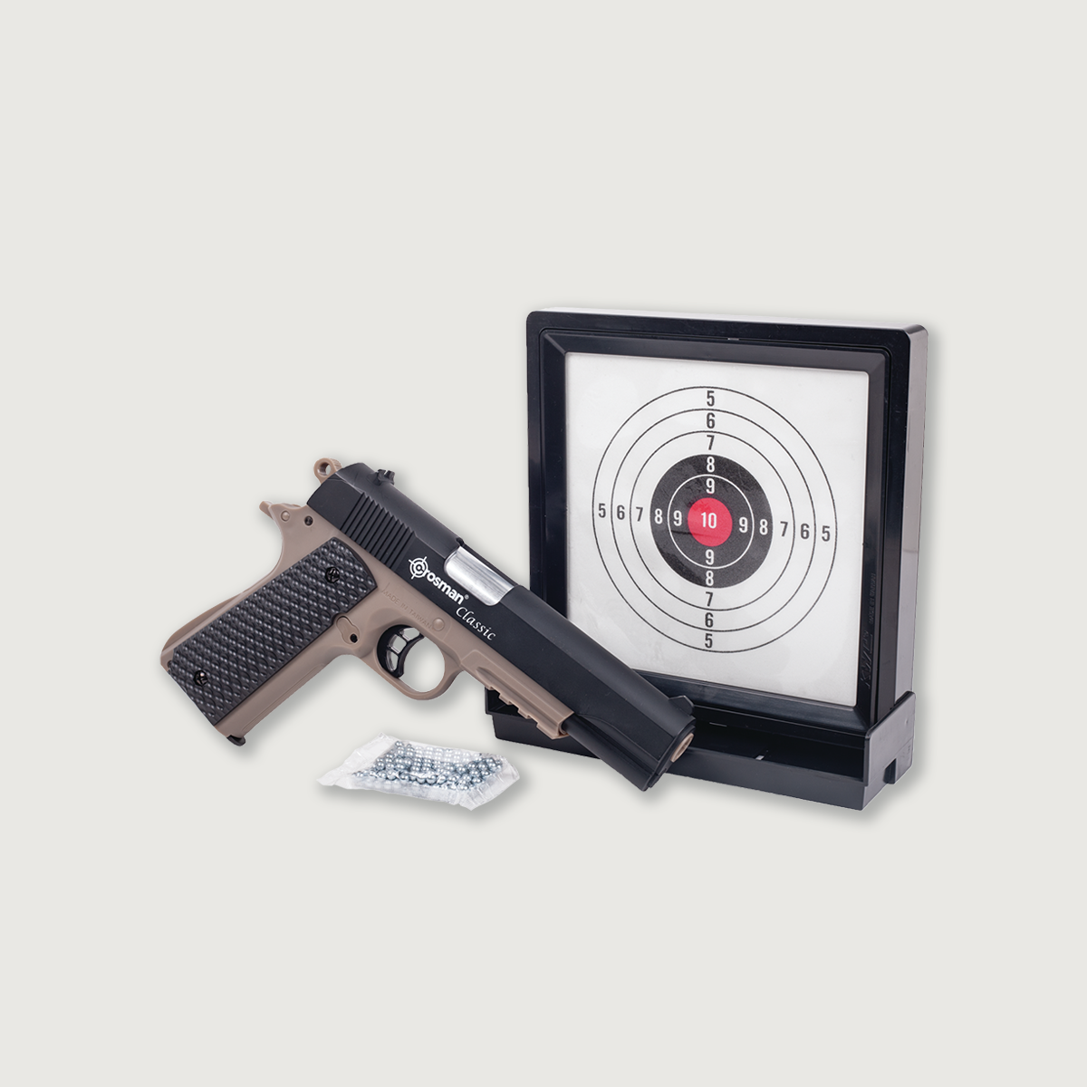 Get some good ol’ fashioned target practice at home with the Crosman Classic 1911 Pistol Kit, a simple, spring-action BB gun, and target kit. Featuring a realistically sized BB pistol, a framed gel target, and 250 steel BBs, so you can get to plinking right out of the box. With a 200 fps maximum velocity, this little shooter is perfect for backyard or basement shooting. The pistol features a bi-tone black/flat dark earth colorway, Picatinny rail for accessories, golf-grip patterned scales for an extra-secure grip, skeletonized trigger, and ring hammer. Pull the trigger on this handy, little target-practice kit today and maintain your aim at a fraction of the cost of hitting up the range.