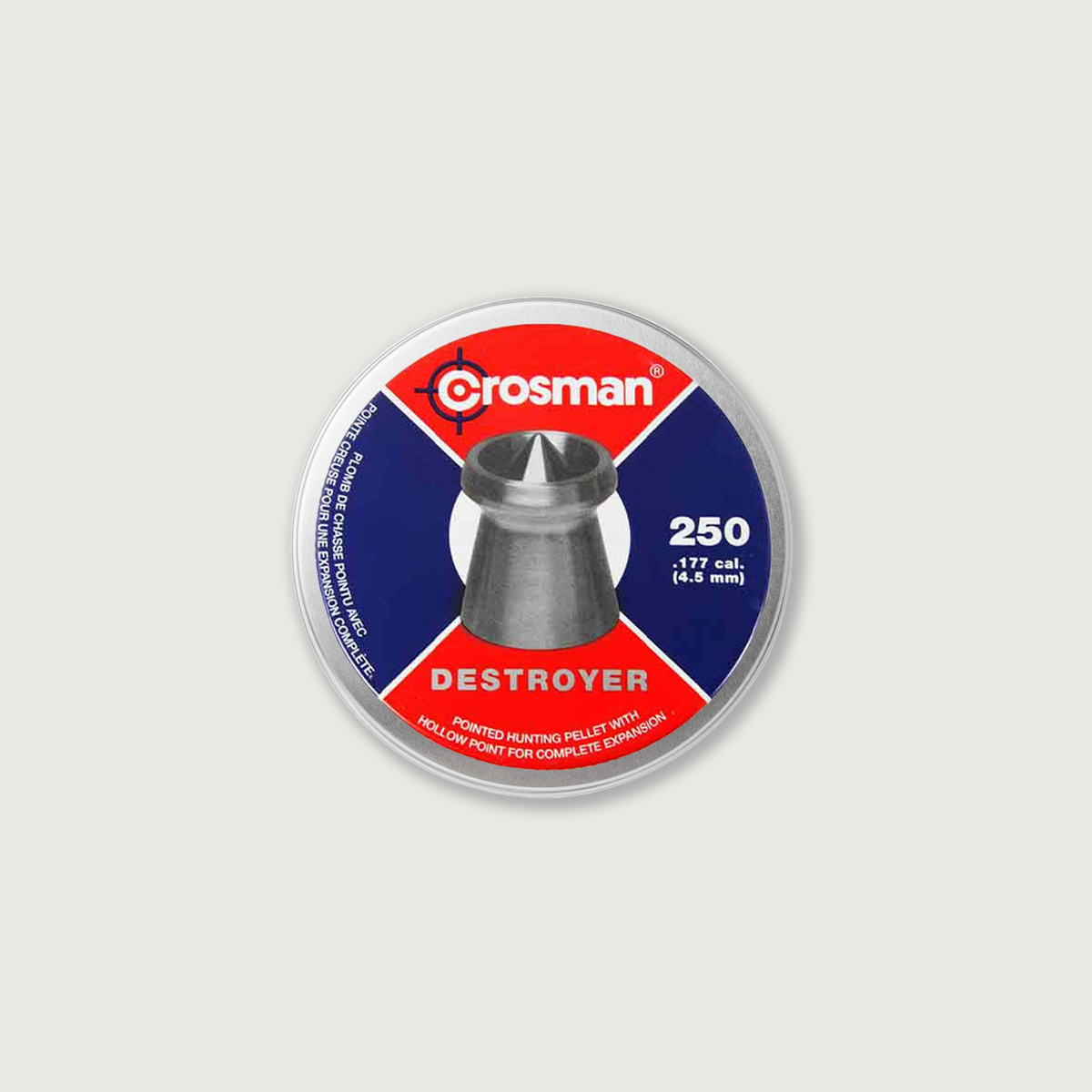 Crosman Destroyer .177 caliber, 7.9 grain pointed with dished rim. A revolutionary new hunting pellet combining the best attributes of a pointed pellet with a hollow point resulting in complete expansion and energy transfer.