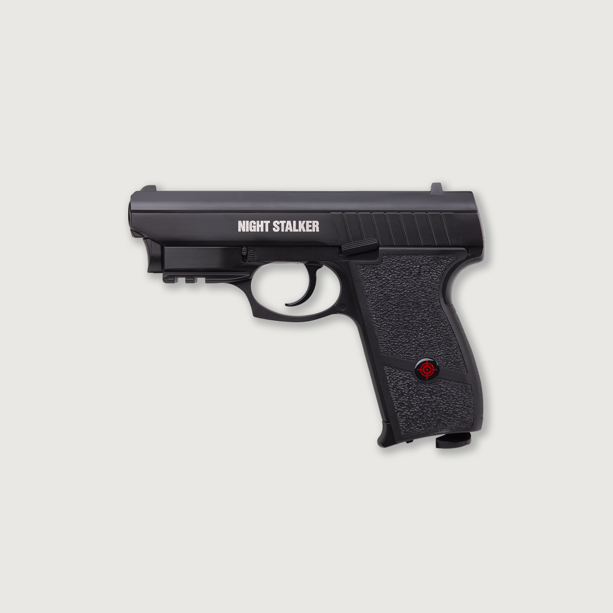 The Night Stalker pistol is a hefty, full-metal, blowback-action repeater with a drop-free, 18-round magazine. Powered by 12-gram CO2 cartridges, it sends steel BBs downrange at up to 420 fps. Just load up the magazine and a fresh CO2 power let and knock down cans or punch holes in paper as fast as you can pull the trigger. The realistic, blowback slide and the stiff recoil the action produces makes the Night Stalker an ideal firearms trainer.