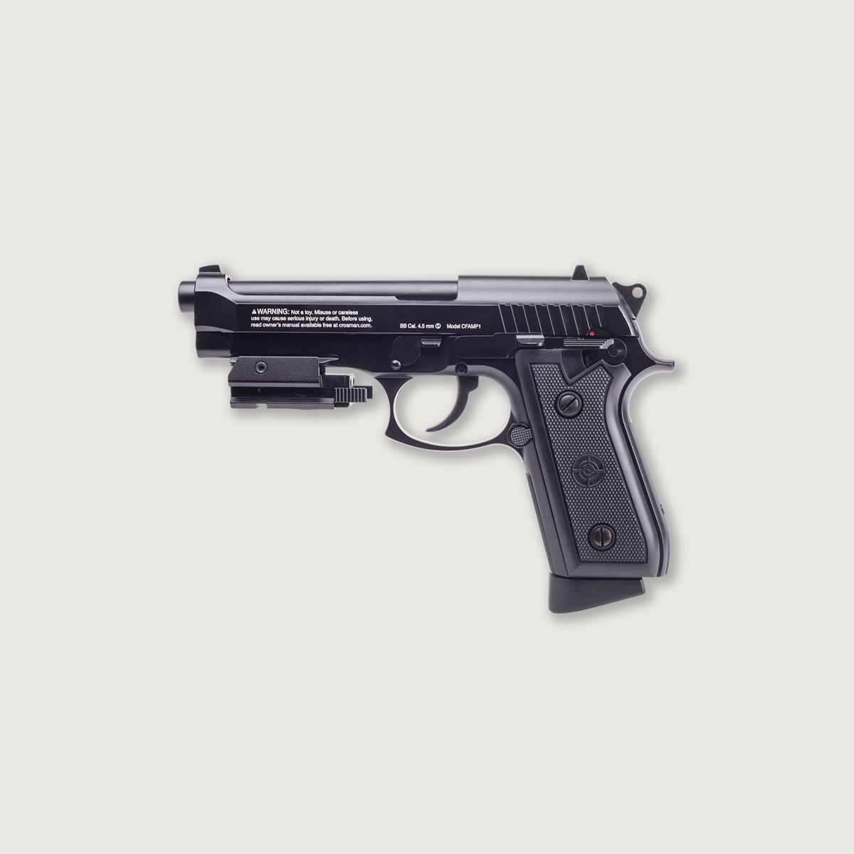 The Crosman Full Auto P1 BB air pistol redefines backyard fun. Able to fire full or semi-auto with a realistic weight and feel, this pistol is perfect for plinking or honing your marksmanship fundamentals. This full-size, all metal, CO2 pistol slings BBs up to 400 fps firing at a cyclic rate of up to 850 rounds per minute. Featuring a realistic blow-back action, removable 19 round magazine that also houses CO2, an accessory rail and removable red laser sight, this pistol has it all.