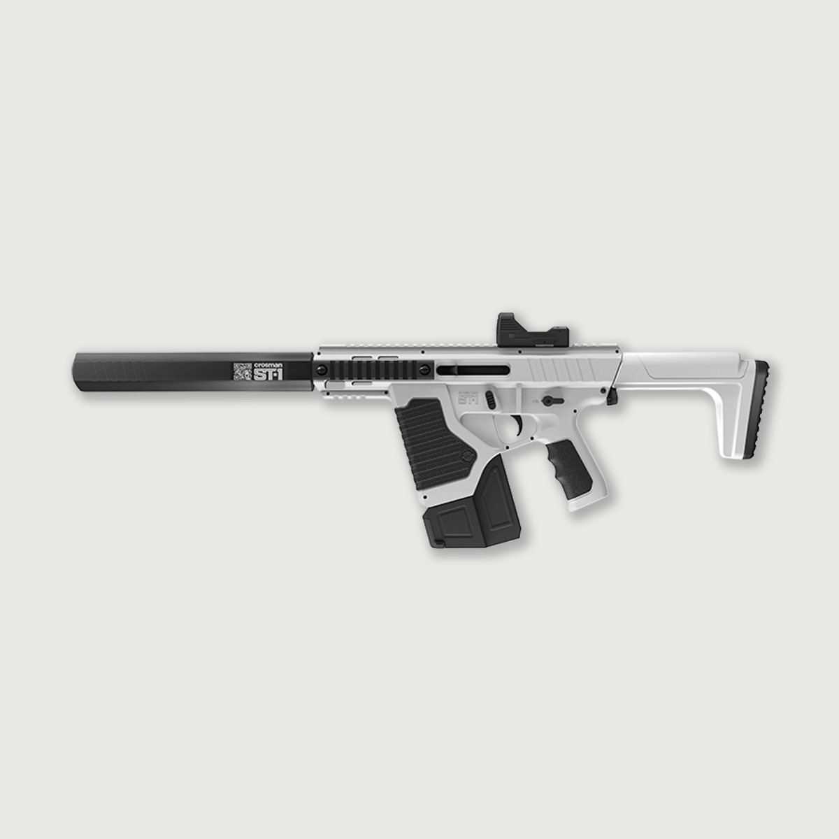 Air power takes a future-tech turn with the Crosman ST-1, a full-auto BB airgun that does dual duty as a rifle and a pistol. The sleek and sexy ST-1 integrates a high-capacity magazine—holding over 400 BBs—so you can blow tin cans to bits.