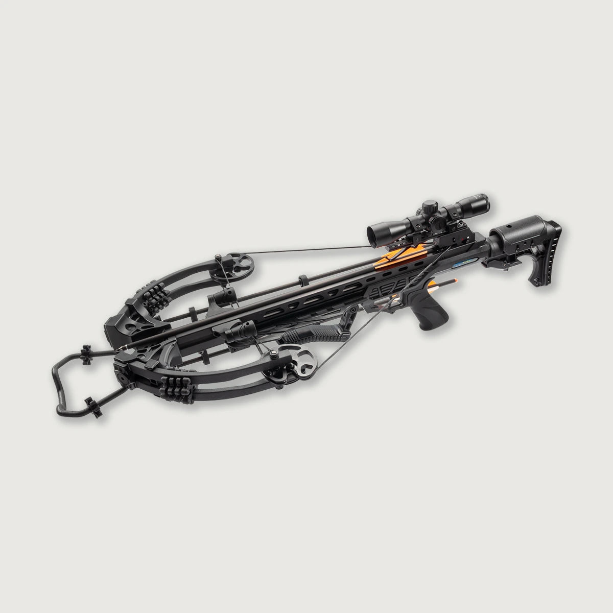 Patented Trigger Technology-Dry Fire-Inhibitor At only 12″ axle-to-axle (when cocked). The MK-XB58 delivers 405 feet per second from a draw weight of only 200 lb. The XB58 is a light narrow crossbow with string stoppers, pistol grip, adjustable stock and fore grip. The Picatinny rail can also accommodate added accessories such as bipods and torches. 20″ Carbon bolt recommended.
