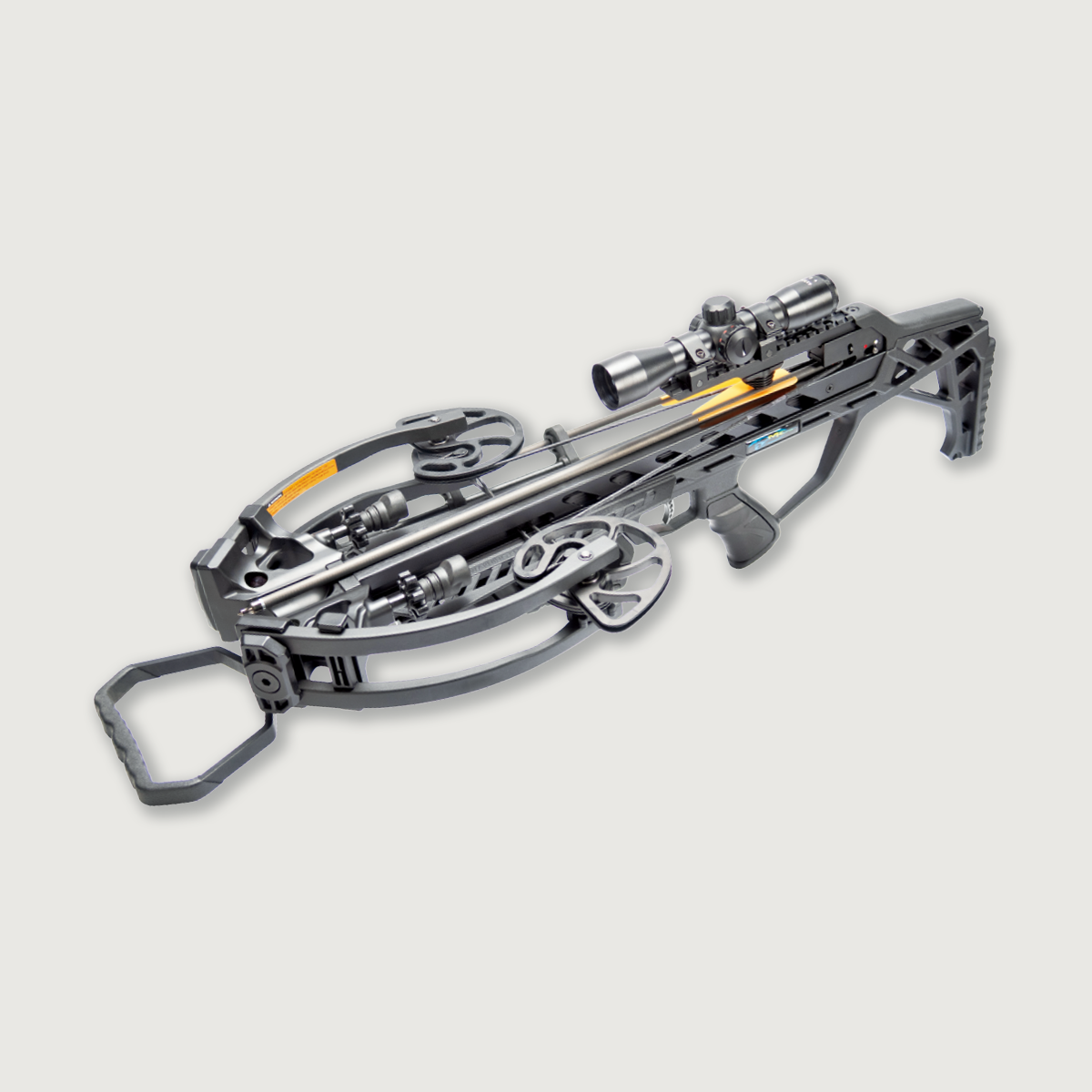 200 LBS – 425 FPS. The Man Kung MK-XB65BK Chester compound crossbow is our most powerful model. It has a bullpup design which means that the string release mechanism is positioned far behind the trigger. In addition, it is featured with reverse cam technology: the string comes off the front of the cams and not off the back as with our other compound crossbows. The combination of this bullpup design and reverse cam technology makes this crossbow a lot shorter and narrower than the MK-XB58BK, while its power stroke (the distance the string travels after pulling the trigger) is slightly longer. This makes it more compact and more powerful at the same time! Another advantage of this MK-XB65BK is that its foot stirrup is foldable, so you can also use it as a bipod. To reduce vibration and noise, it is featured with vibration dampers between the cams and the limbs and at the string stoppers. To prevent dryfiring, it is equipped with an anti-dryfiring system. Picatinny rails are mounted both on the top and on the bottom of this crossbow. On the bottom rail you can mount the front grip and quiver that come with this crossbow, but also a laser or a light. It also comes with a 4×32 scope, a sling, a cocking string and 4 carbon bolts. Due to its gigantic velocity of 130 m/s, it is especially suitable for experienced shooters.